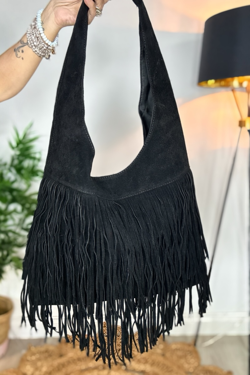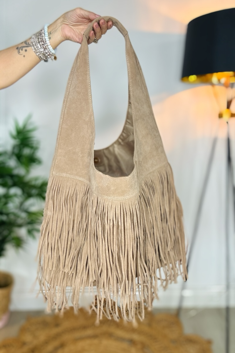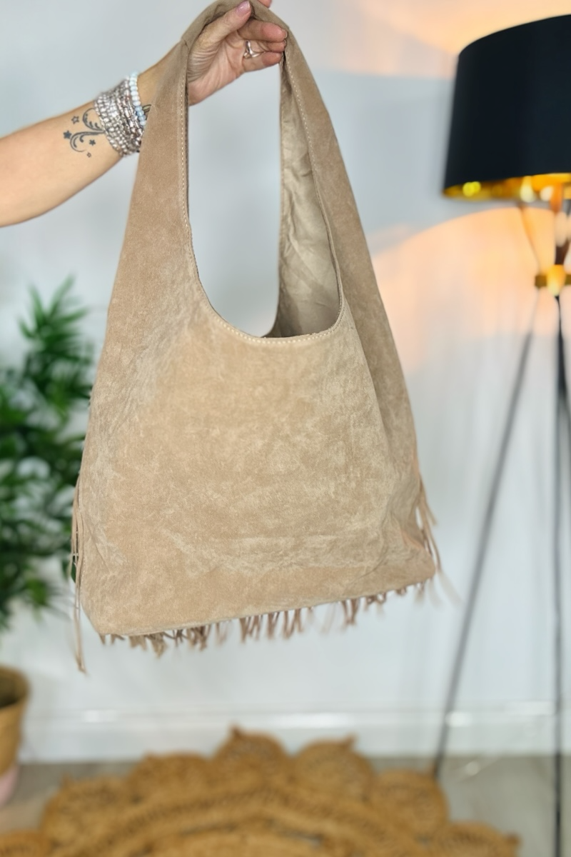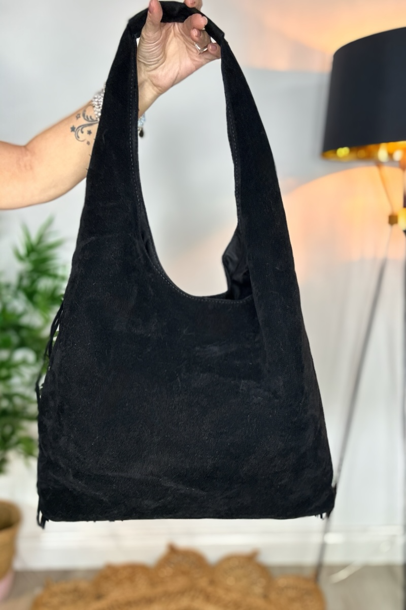 The Fran Fringed Faux Suede Bag offers a stylish blend of function and fashion. Crafted from soft faux suede, its fringed design adds a distinctive, artisanal touch. Inside, practical pockets keep your essentials organized, while a secure magnetic clasp ensures easy access with reliable closure. This hobo bag combines supple texture with thoughtful details for everyday versatility.