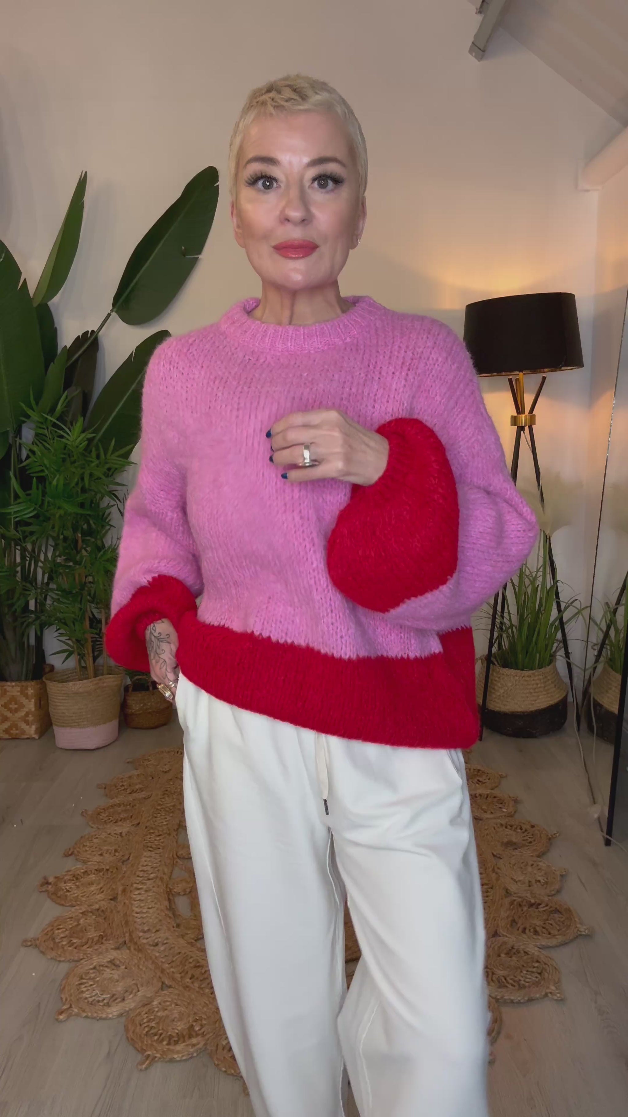 Add a bold pop of colour to your everyday wardrobe with this soft, stretchy colour-block knit jumper. Designed in a striking pink and red palette, this cosy knit features a relaxed fit, classic round neckline and statement balloon sleeves for a modern, flattering silhouette. Crafted from a stretch knit, it offers all-day comfort while keeping its shape beautifully. Perfect for effortless styling with jeans, trousers or skirts for a chic, feel-good look