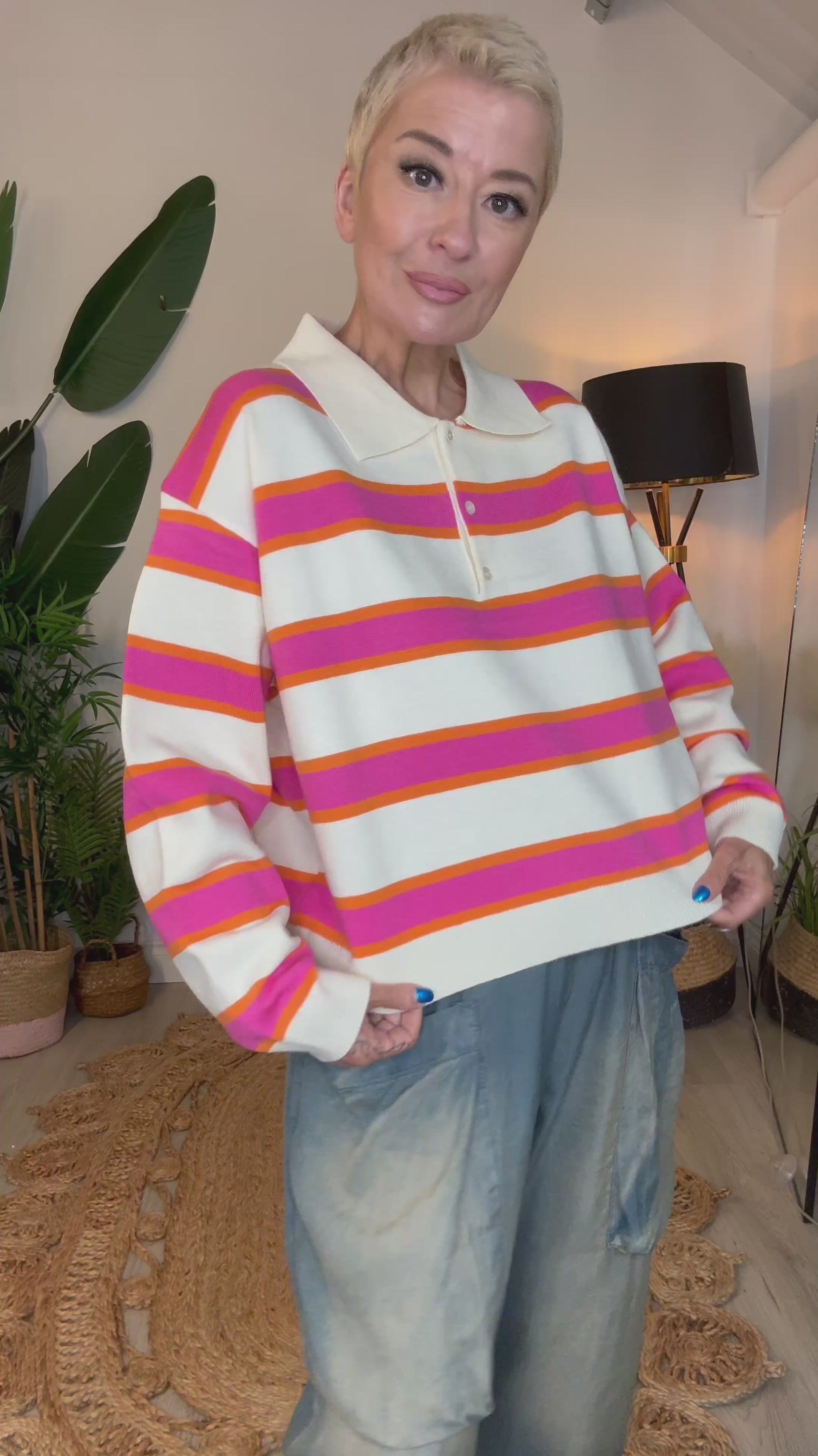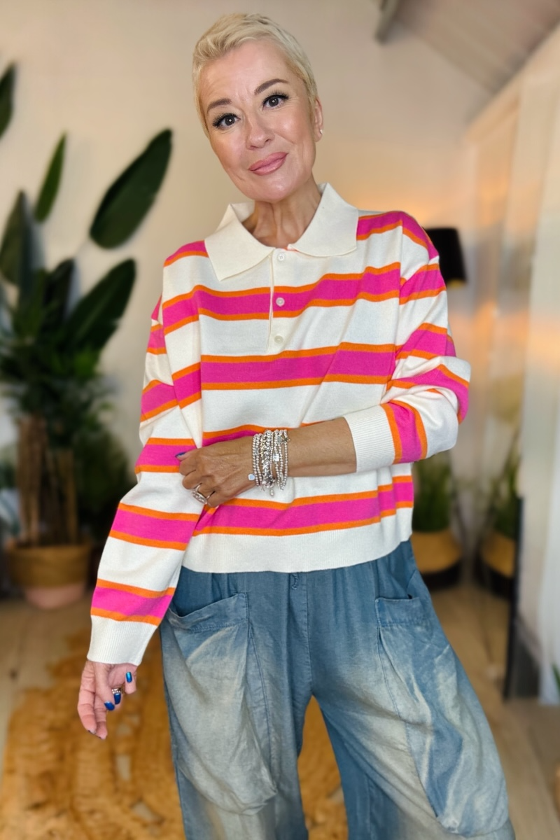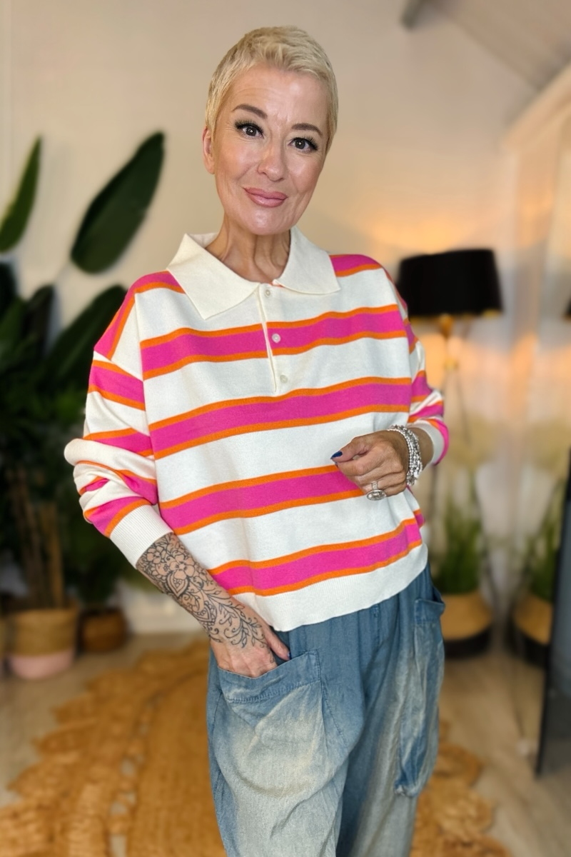 A fresh take on a classic, this knitted polo jumper features a collared neckline with button detailing and bold, thick stripes for a standout look. Made from a soft knit, it’s easy to wear and perfect for layering or styling solo. Effortlessly cool with a relaxed, everyday feel.
