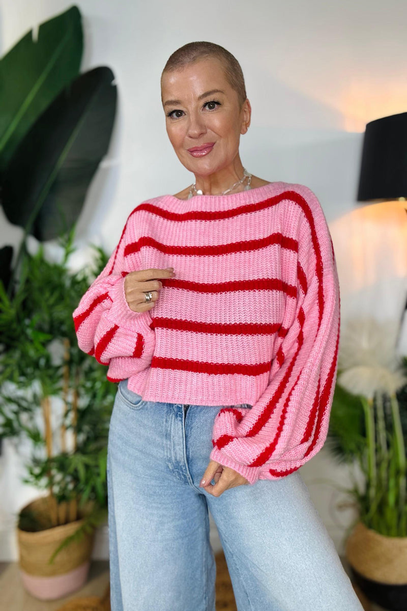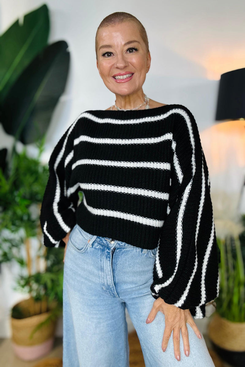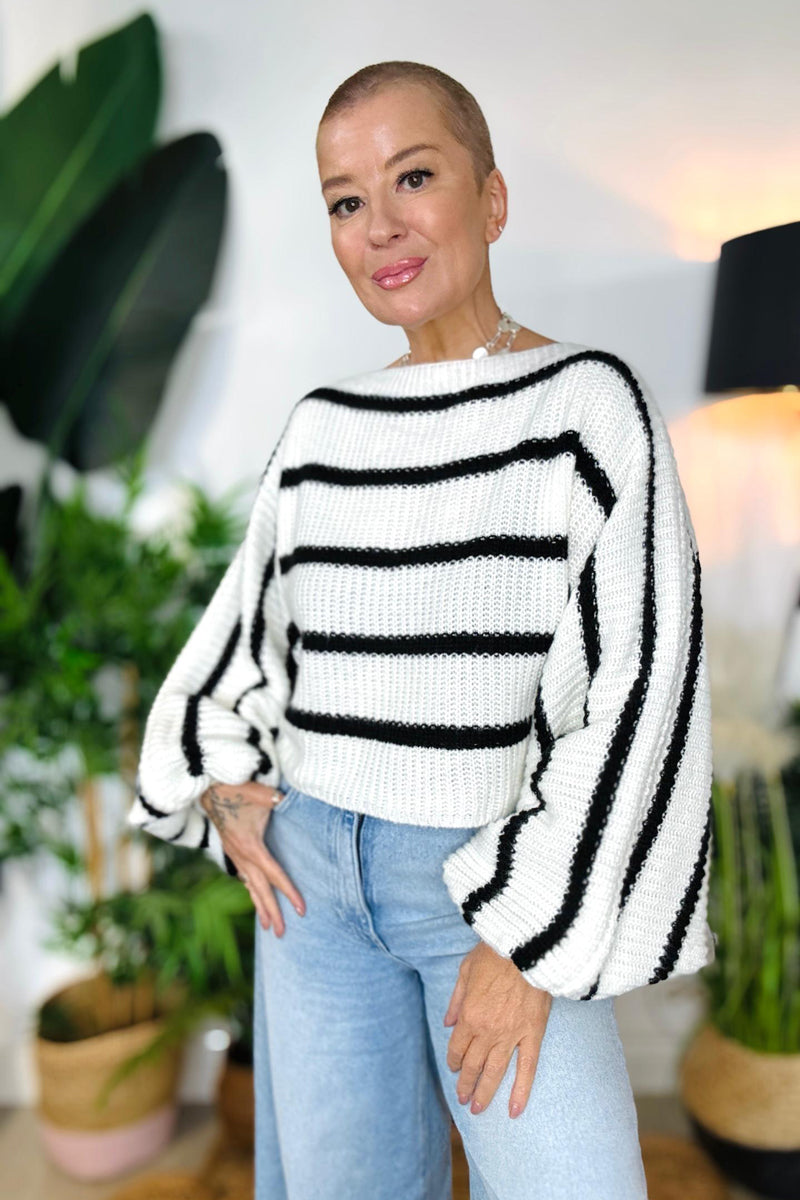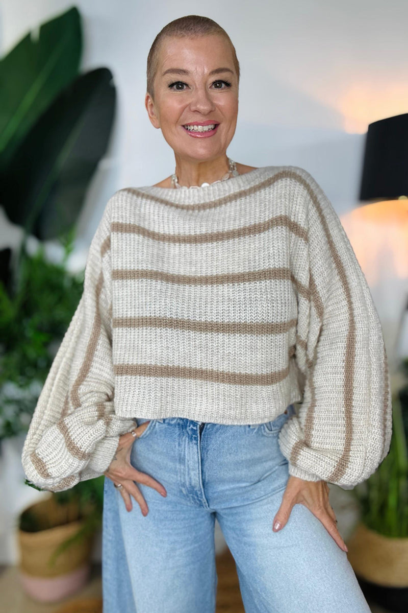 Fall in love with the Sweetie Jumper - a playful, airy knit perfect for relaxed afternoons and spontaneous adventures. Its balloon-shaped sleeves and ribbed striped texture bring a touch of retro charm, while the poncho-style shorter length and slash neckline keep things laid-back yet unique.