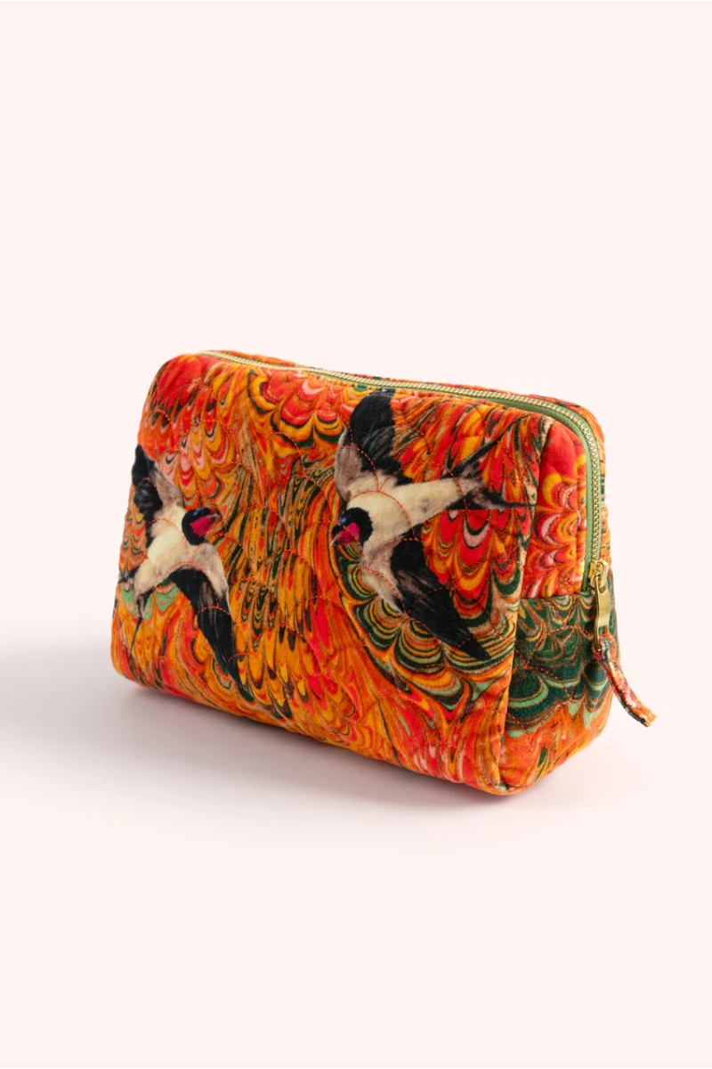 Nothing says cold weather luxury like velvet, and combining it with bespoke Powder print on this Wash Bag makes for the ultimate statement piece this season. Gorgeous scalloped quilting adds another layer of luxurious texture. This Marbled Swallows design combines two prints in one for a psychedelic Autumnal treat!