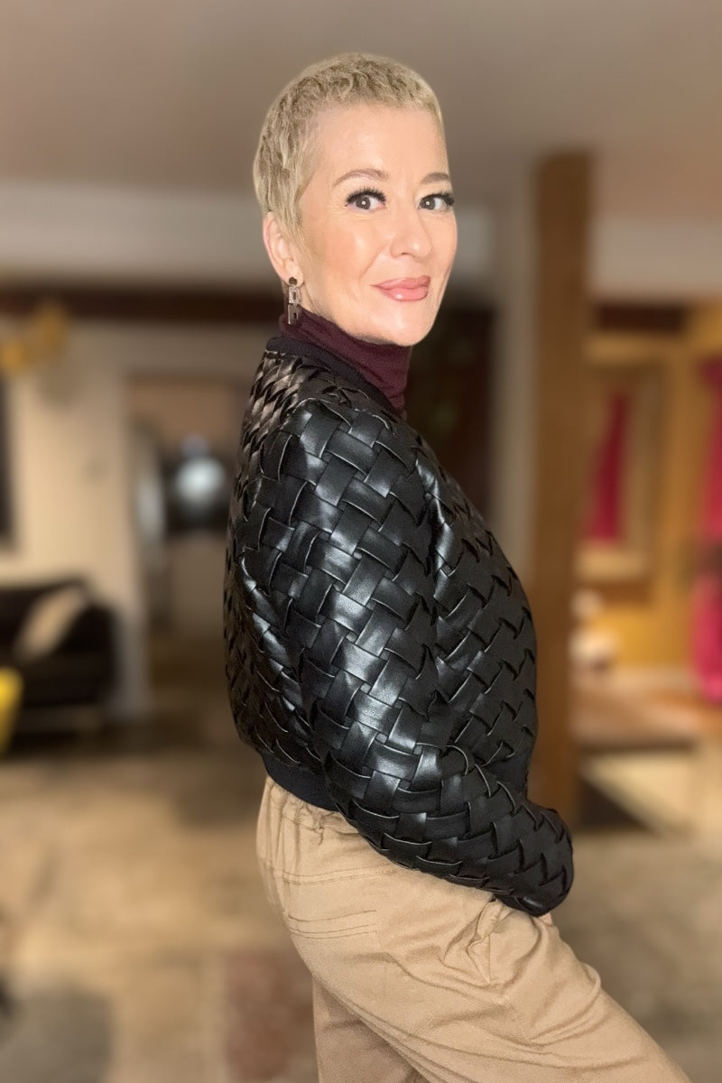The Lattice Faux Leather Jacket is that cool, textured layer you’ll wear on repeat. Designed with a collarless neckline, zip front, and ribbed cuffs and hem, it mixes a laid-back shape with a touch of edge. The lattice finish gives it that something extra — effortless, but never ordinary.