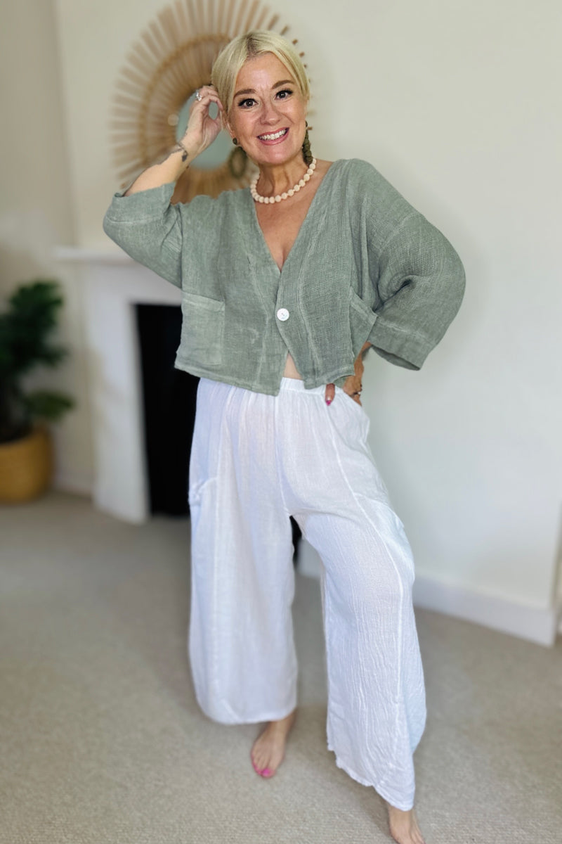 Cool, comfy, and effortlessly stylish — the Mina Linen Barrel Leg Trousers tick all the boxes. Cut in a relaxed shape with an easy elasticated waistband and lightweight feel, they're made for warmer days. The barrel leg silhouette adds a modern edge, while two front pockets keep things practical. Pair with a simple tee or floaty blouse and you’re good to go.