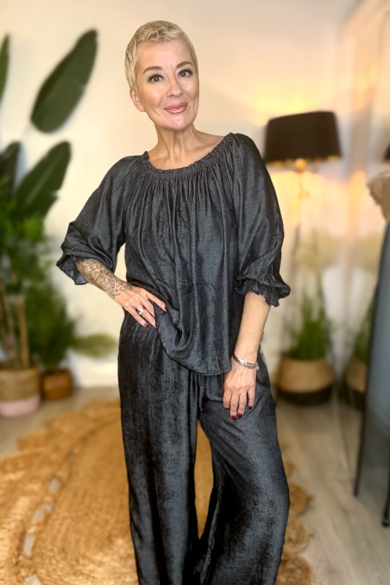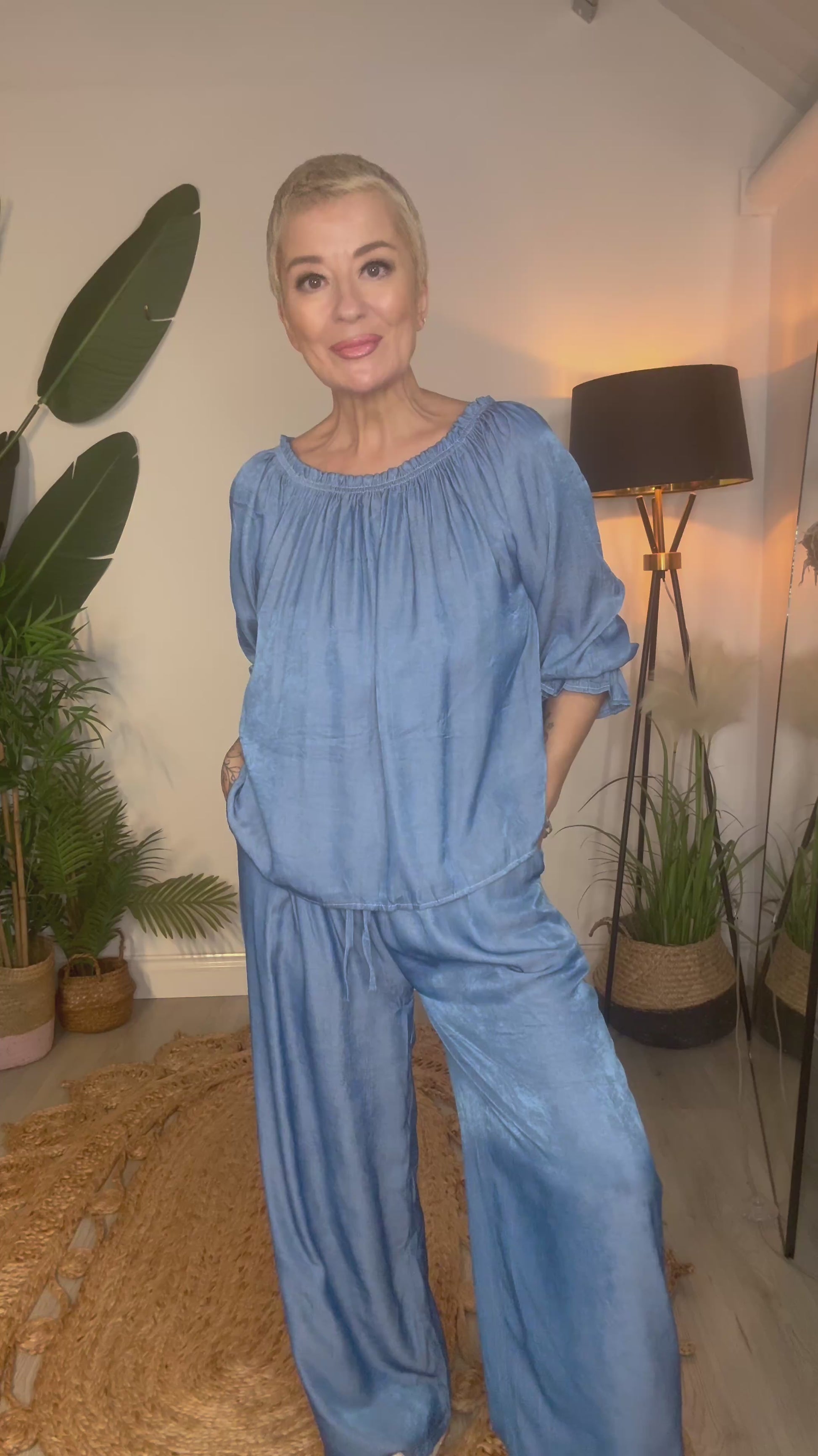 The Anywhere Denim Style Set is your go-to for effortless, everyday style. This lightweight two-piece is crafted from soft fabric with a denim style for a relaxed, floaty feel that moves with you. The bardot-style top can be worn on or off the shoulder, while the wide-leg trousers feature a comfy elasticated waistband for all-day ease. Perfect for shopping days, travelling, or whenever comfort is key without compromising on style.