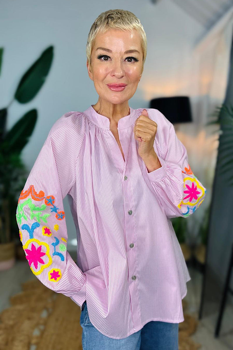 Unexpected in the best way. The Electric Bloom Shirt blends classic pinstripe with bold neon floral embroidery blooming across the sleeves - a little tailored, a little wild.