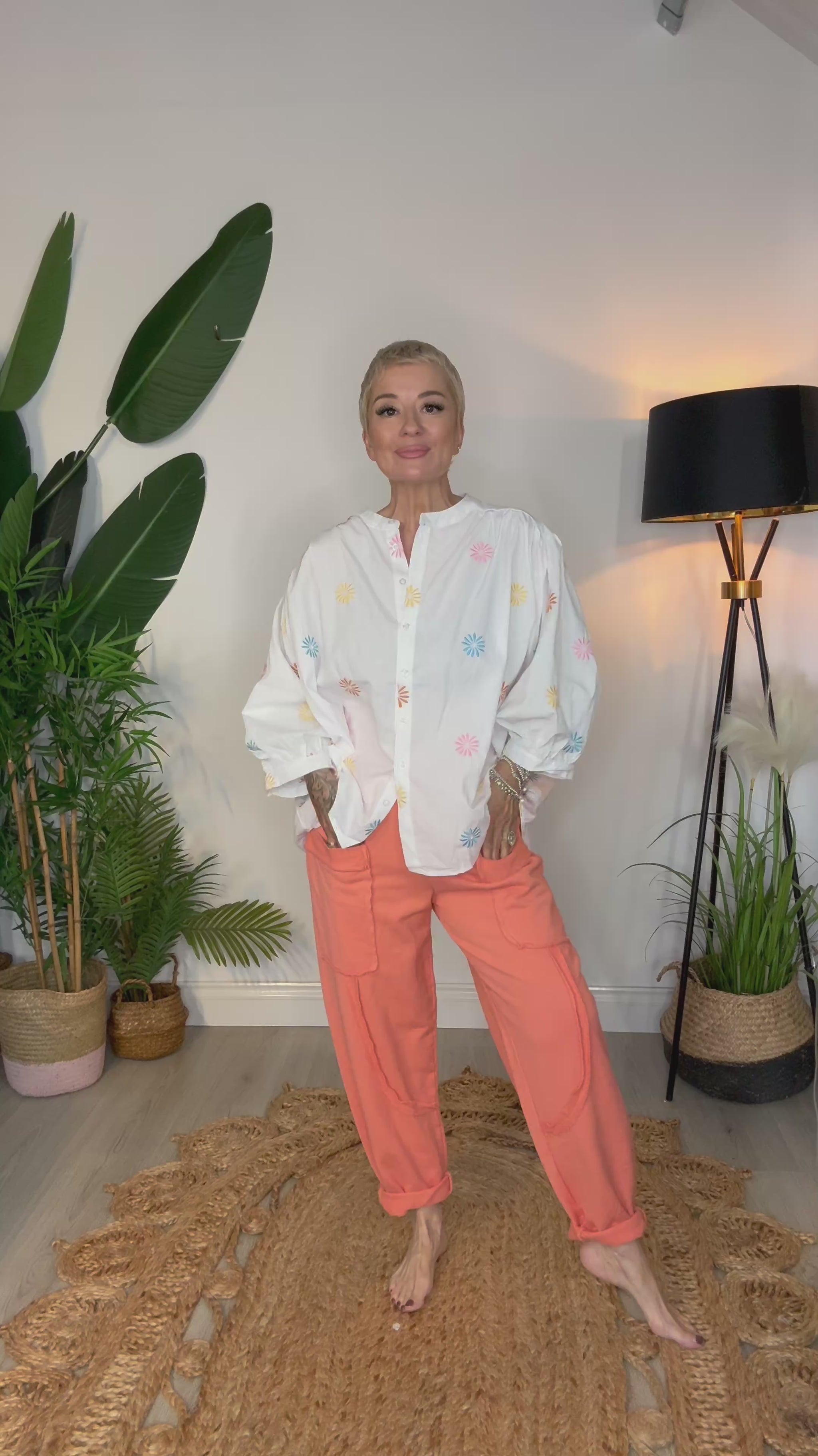 Playful, bold, and effortlessly boho, the Marigold Blouse features statement embroidered flowers, a classic mandarin collar, and a button-down front. The smocked back adds shape and comfort, while the relaxed silhouette makes it perfect for layering over denim, skirts, or wearing on its own for a whimsical, everyday look.