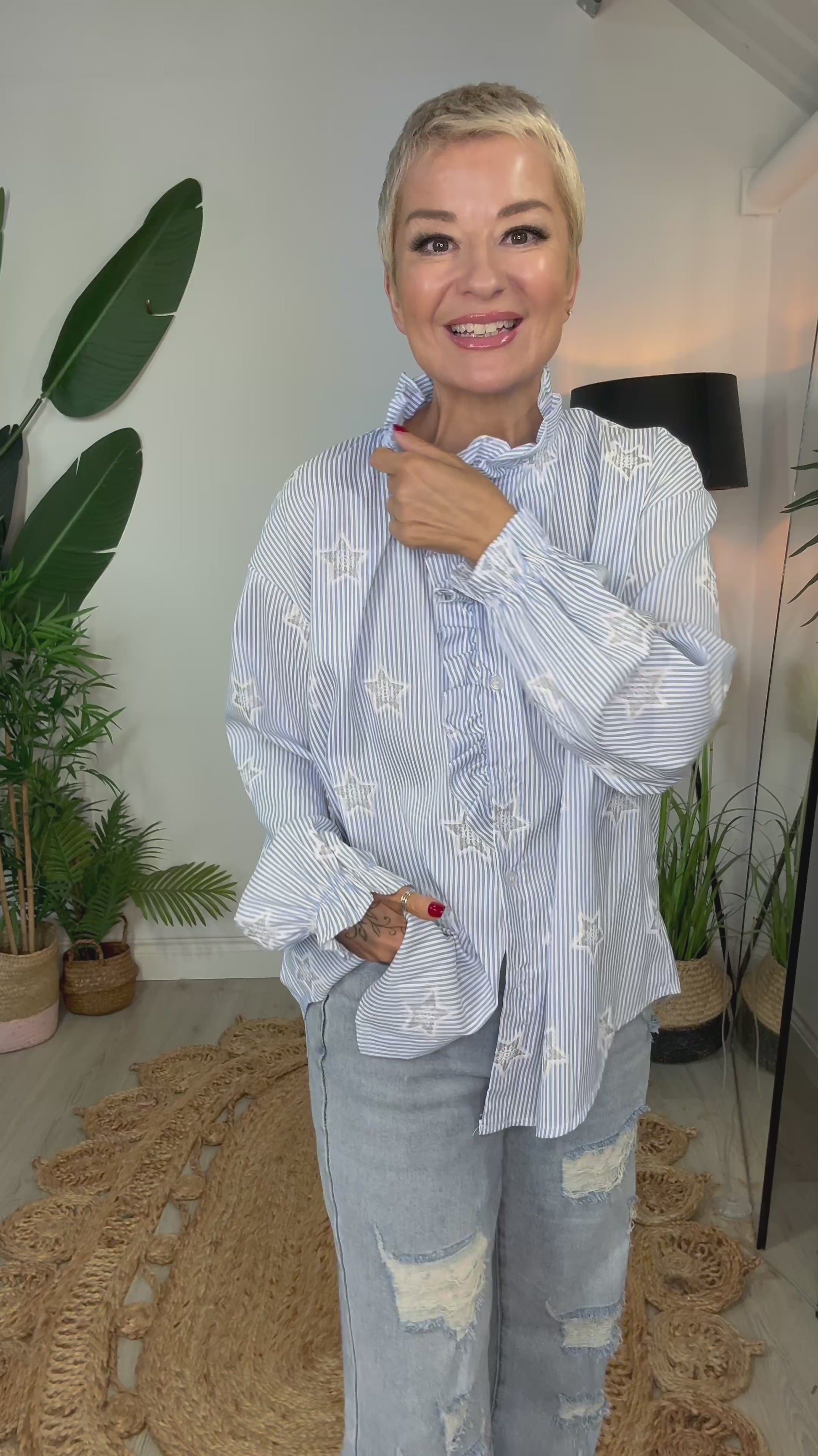 Classic with a celestial twist. The Starlight Pinstripe Shirt reworks timeless blue-and-white pinstripe with bold embossed stars scattered throughout for a playful, statement feel. Finished with a soft ruffle neckline and cut in a regular, easy fit, it blends structure with something a little dreamier. Wear it tucked into vintage denim or layered loose for that effortless, lived-in look.